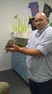 After we walked around a bit we entered the Reptile Room... snakes and lizards oh my. I've always been one to think bigger is better when it comes to snakes. The bigger they are the easier they are to spot. Great until you are in a room with glass cases all around full of snakes and legless lizards. The owner did get out "Jigsaw". He was a Ball Python. Not real big, but very calm and used to being handled. I only got pictures of two of my girls and my hubby holding him. My oldest did it before we were there and she wasn't doing it again after that, lol.